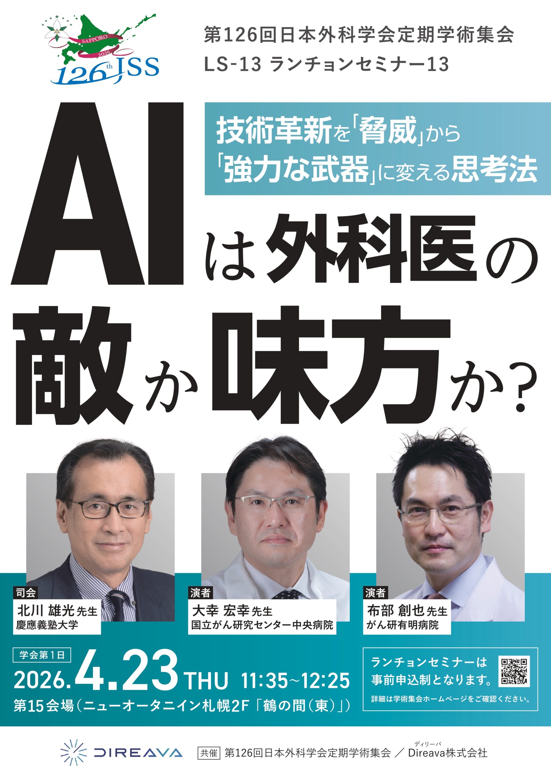 2026.03.27 News 第126回日本外科学会定期学術集会(4/23~25 於札幌)において、ランチョンセミナー『AIは外科医の敵か味方か ~技術革新を「脅威」から「強力な武器」に変える思考法』を共催いたします。